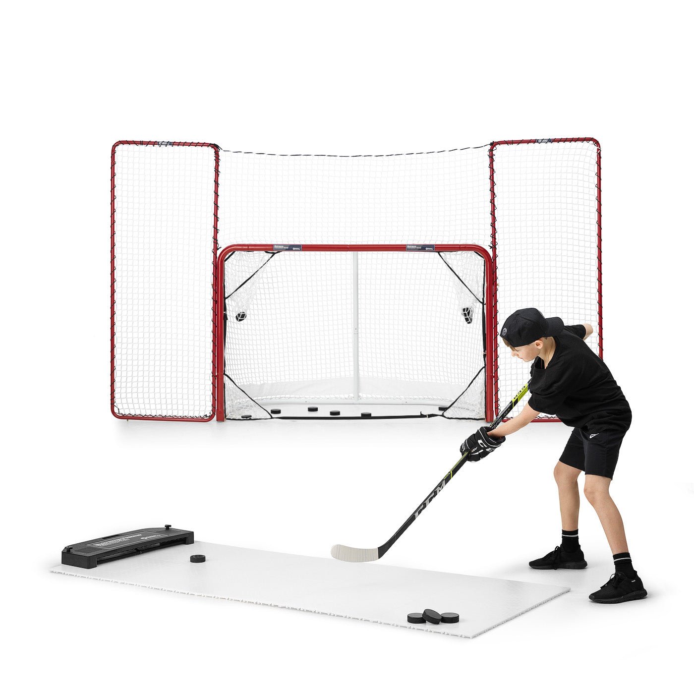 En suverän skottramp när du vill träna skott som proffsen i NHL. Målbur av hög kvalitet och plastis med extremt bra glid med svarta puckar samt marknadens bästa hockeypassare.