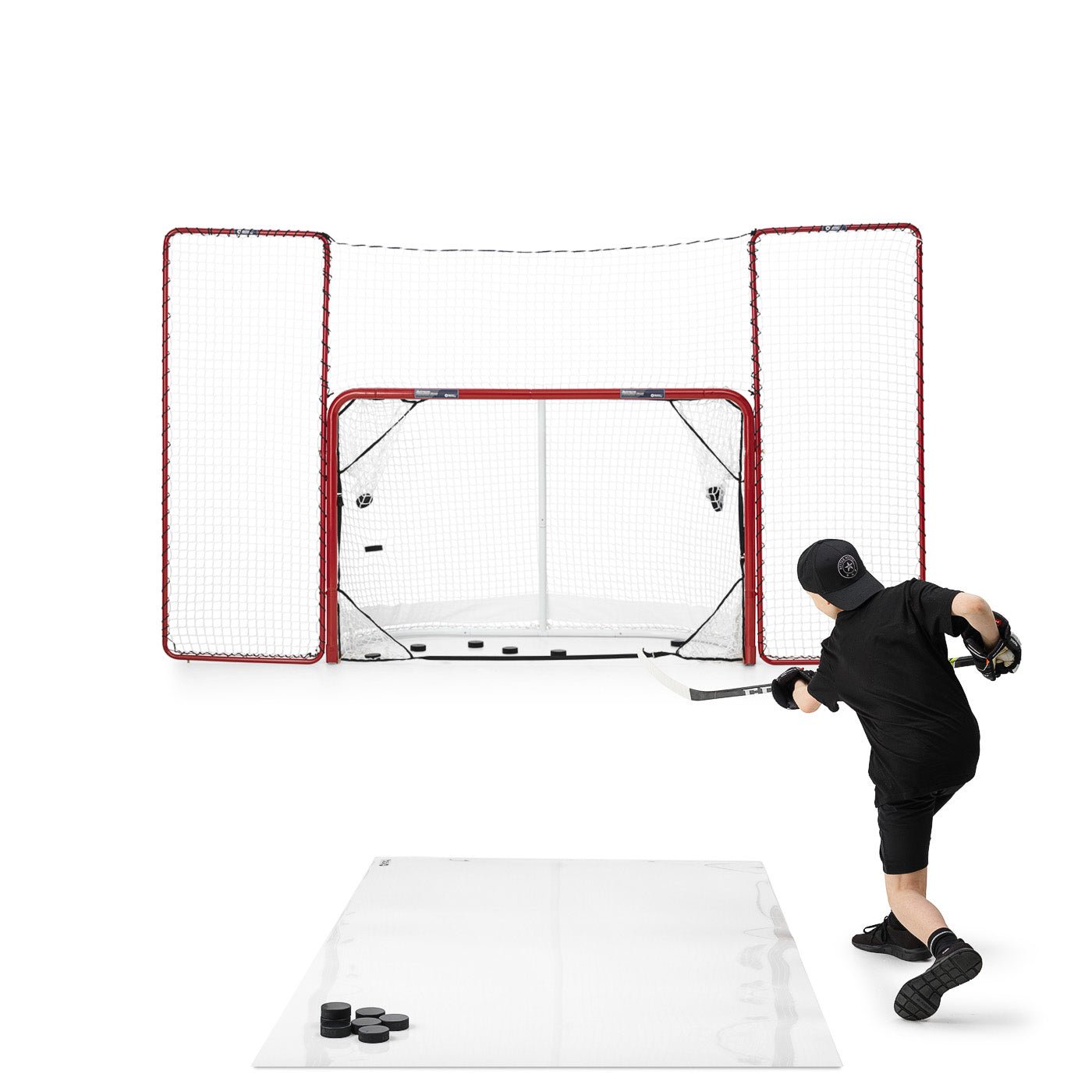 n suverän skottramp som gör att du kan träna skott som proffsen i NHL i ditt eget hem. Målbur, skyddsnät, måltavlor och en skottplatta i toppklass på 4,2 m².